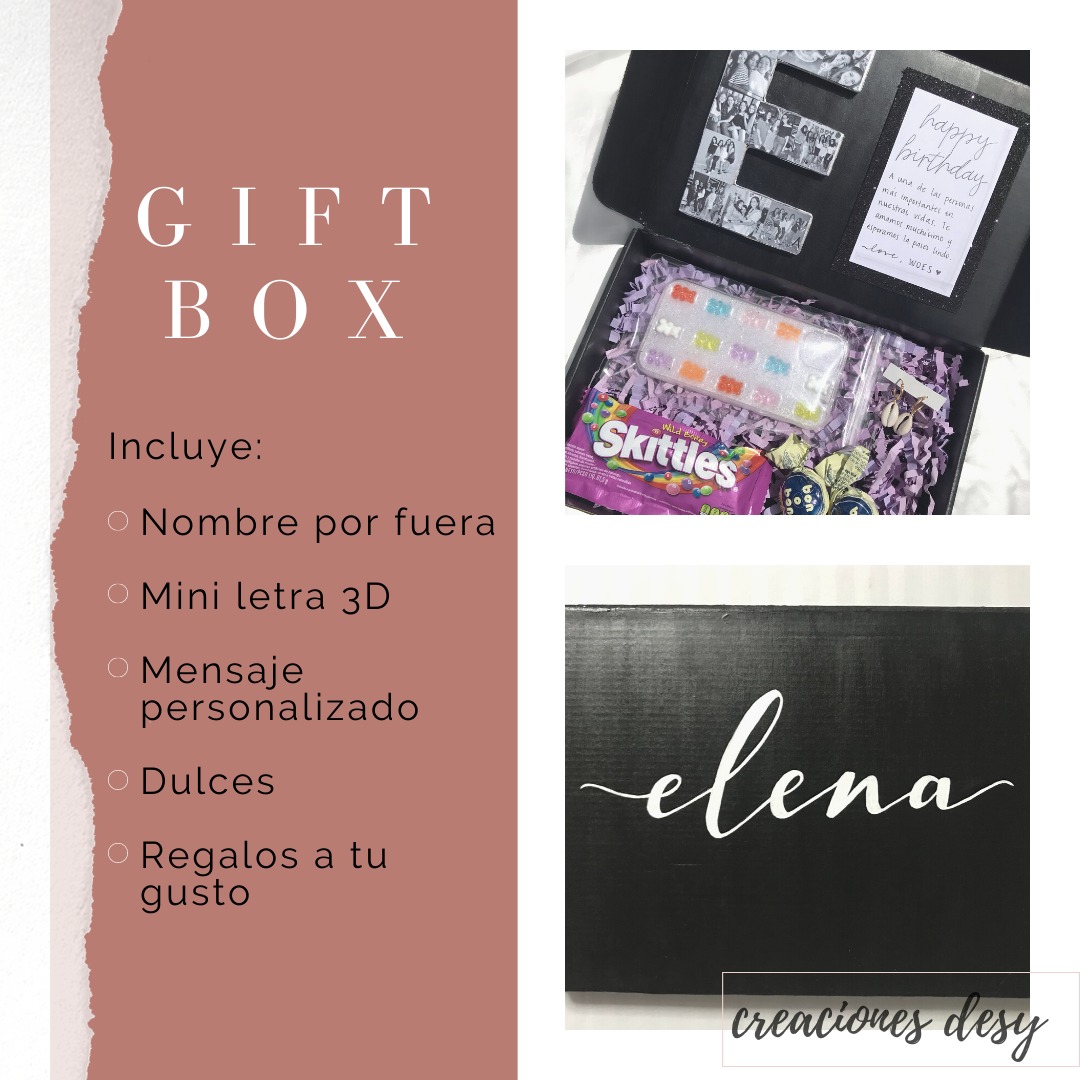Gift Box incluye: Nombre por fuera, mini letra 3D, mensaje personalizado, dulces y regalos a tu gusto. Precio varia de acuerdo a los dulces y regalos que desees agregar.
