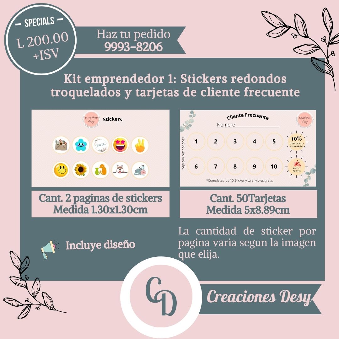 Kit de 2 paginas de stickers troqueladas (Tamaño 1.30x1.30cm) + 50 tarjetas (Tamaño 5x8.89cm), le incluye diseño.