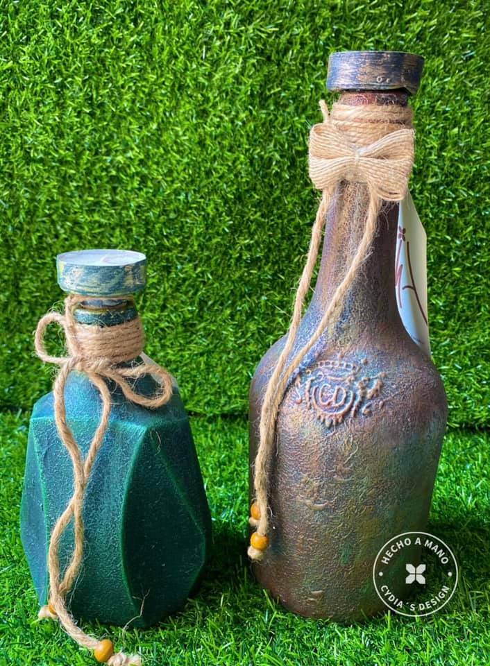 Botellas metalizadas, con función de candelabro y un toque rustico. Se venden por separado.